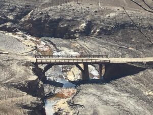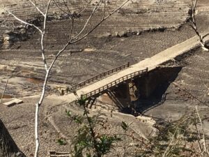 僅かに流れるダム底の水・・・・皮肉にも沈んだ橋が元の川の上に掛かる橋に戻っています。